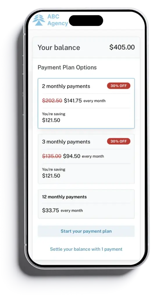 Accounts receive personalized links to a secure online payment portal, where they can view balances, set up plans, and make payments anytime.